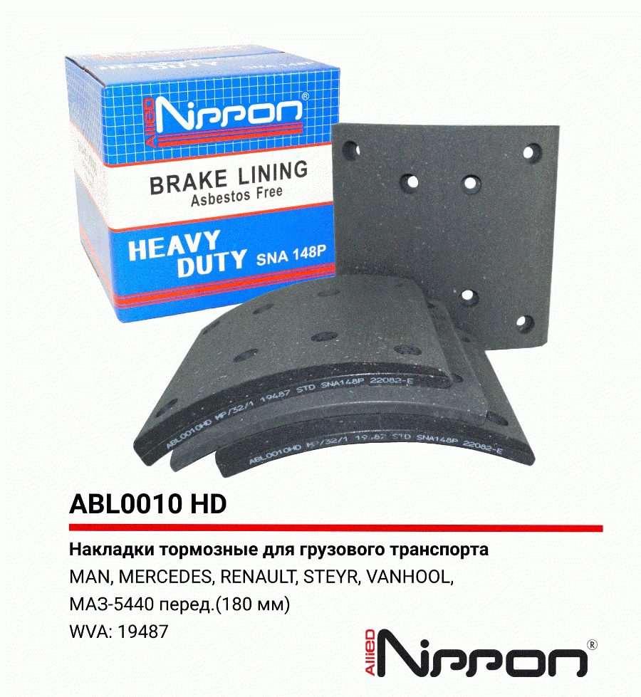 Накладка тормозная 19495/19487 STD MB O300-/O400-/ Setra S200-/S300/ Actros/Antos/Arocs/Axor/Atego/Econic/ MAN F/M/L 2000, F/M/G 90, F 7/8 Allied Nippon abl0010hd