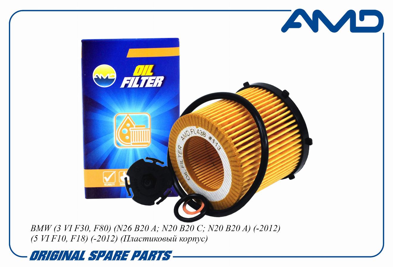 Фильтр масляный BMW 3 VI F30, F80, N26 B20 A, N20 B20 C, N20 B20 A, -2012, 5 VI F10, F18, -2012, Пластиковый корпус AMDFL438 amdfl438