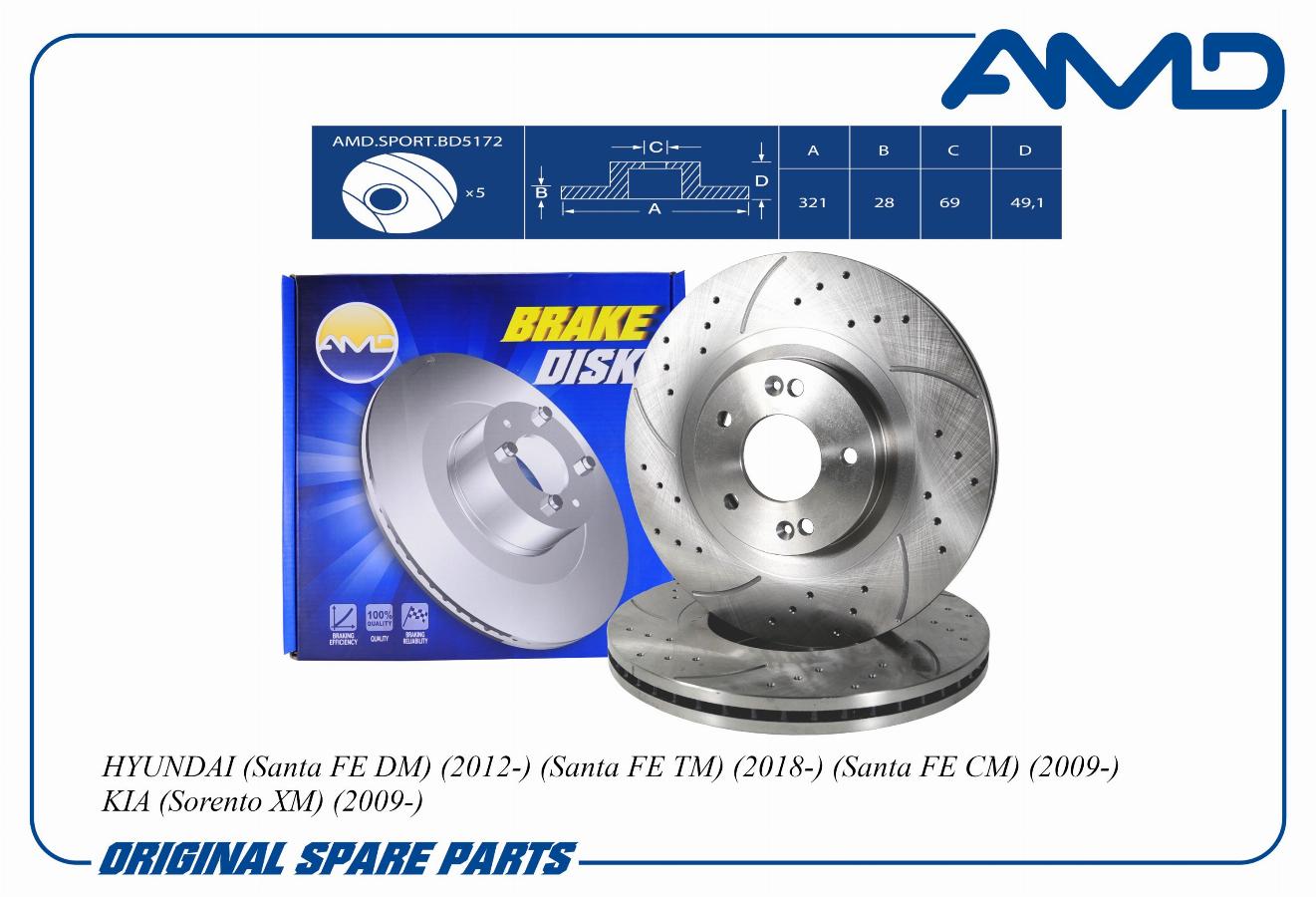 Диск тормозной передний Hyundai Santa Fe 2.7i V6/2.2CRDi 2WD/4WD 06> AMD amdsportbd5172