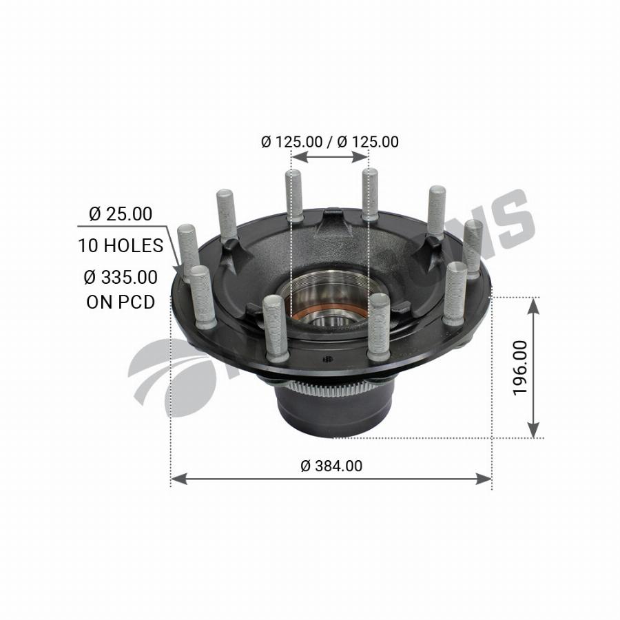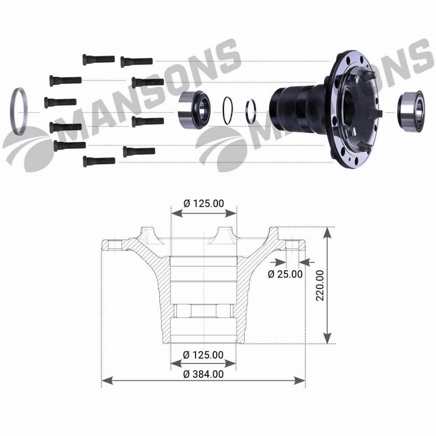 Ступица колеса 125*384*164.5*n10 с подшипником Volvo FL 6 (2000-), FL, FE/FH/FM/FMX/NH 9/10/11/12/13/16/Renault Premium II TR/DXi 7/Kerax /DX/K Mansons 900654