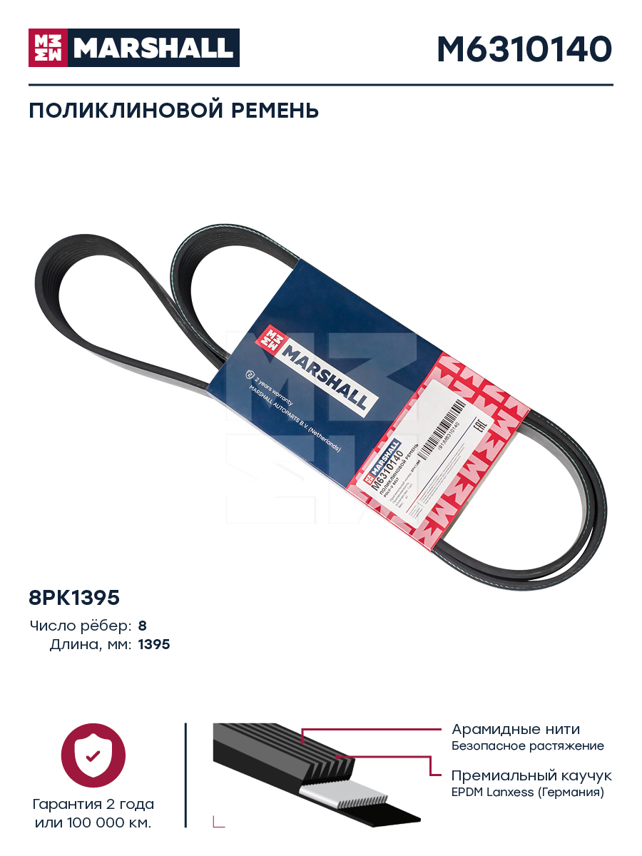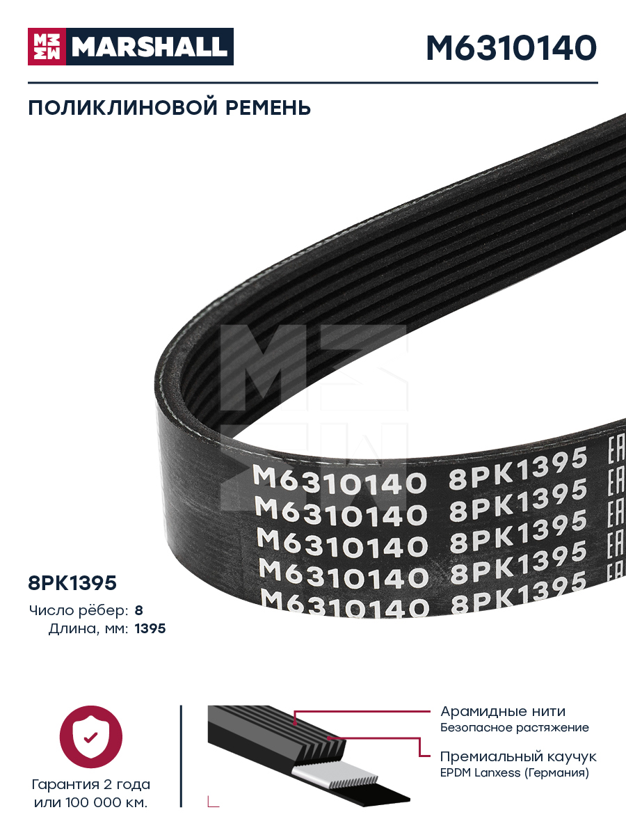 Ремень поликлиновой 8PK1385/8PK1395 MB Actros/Antos/Arocs/Axor/ Atego/Econic/ O 500-/ Setra S 400-/S 500-Series OM904LA, OM906LA, OM924LA, OM926LA Marshall m6310140